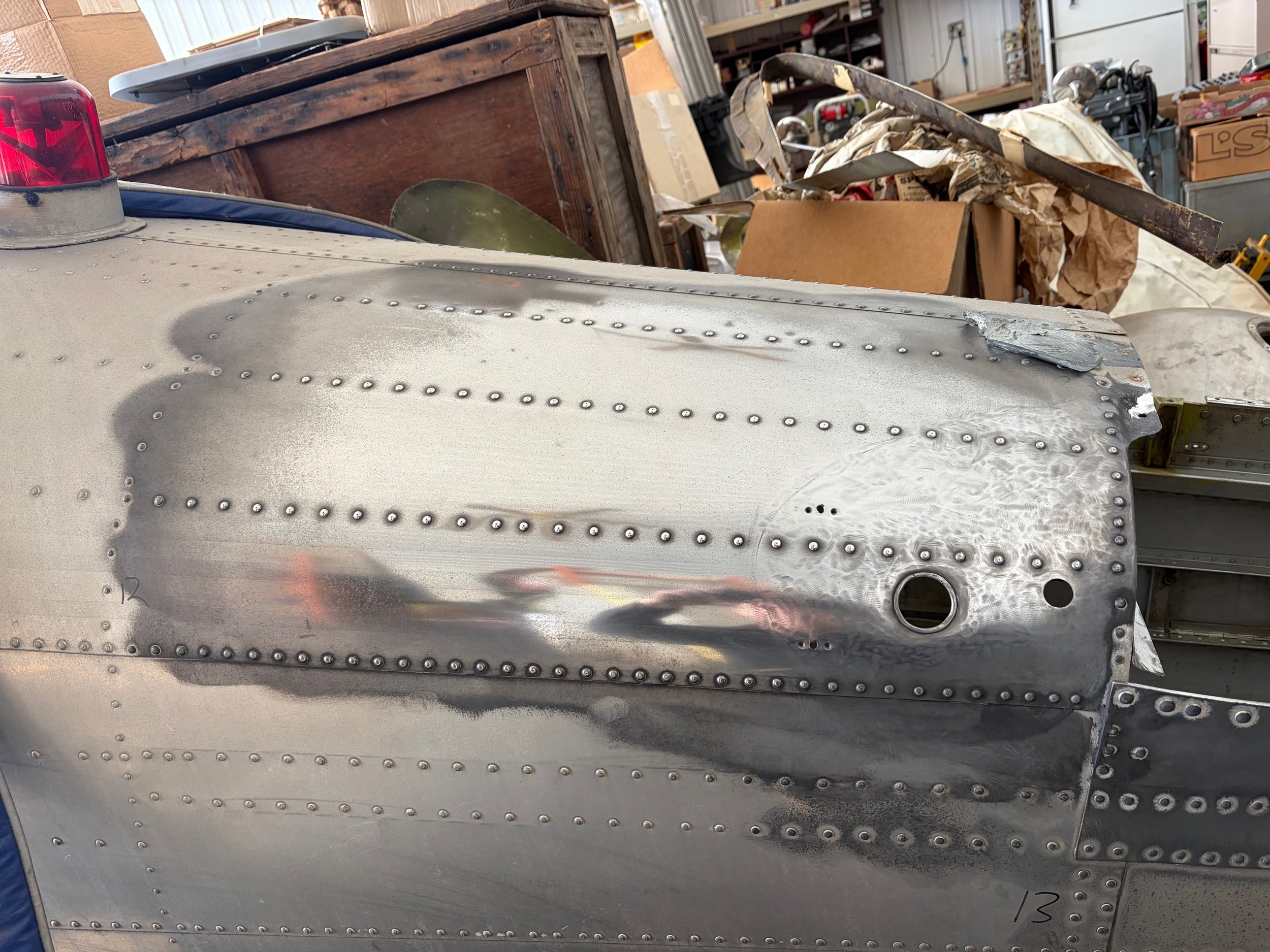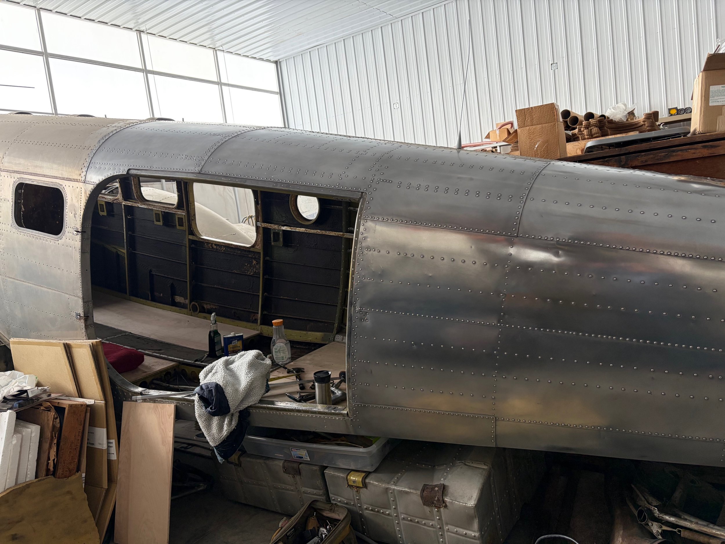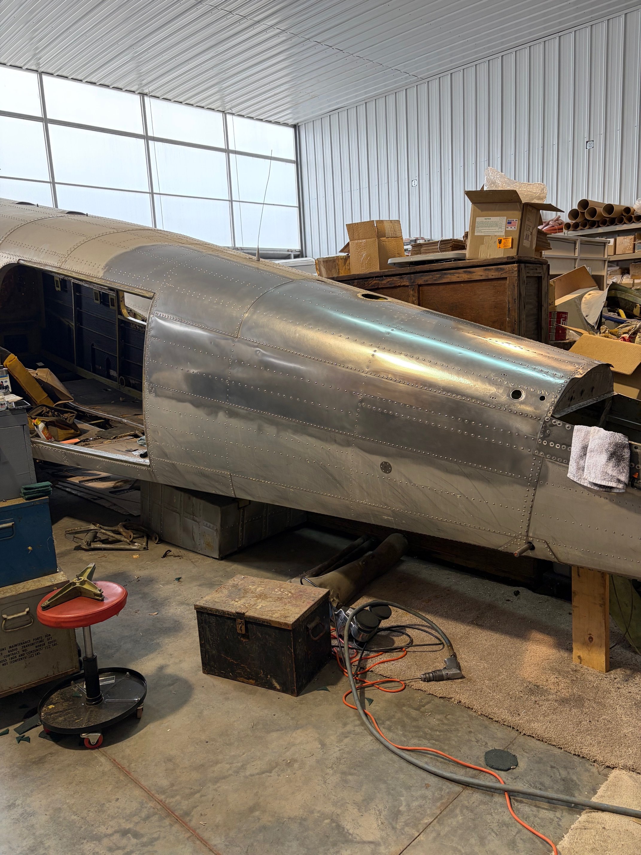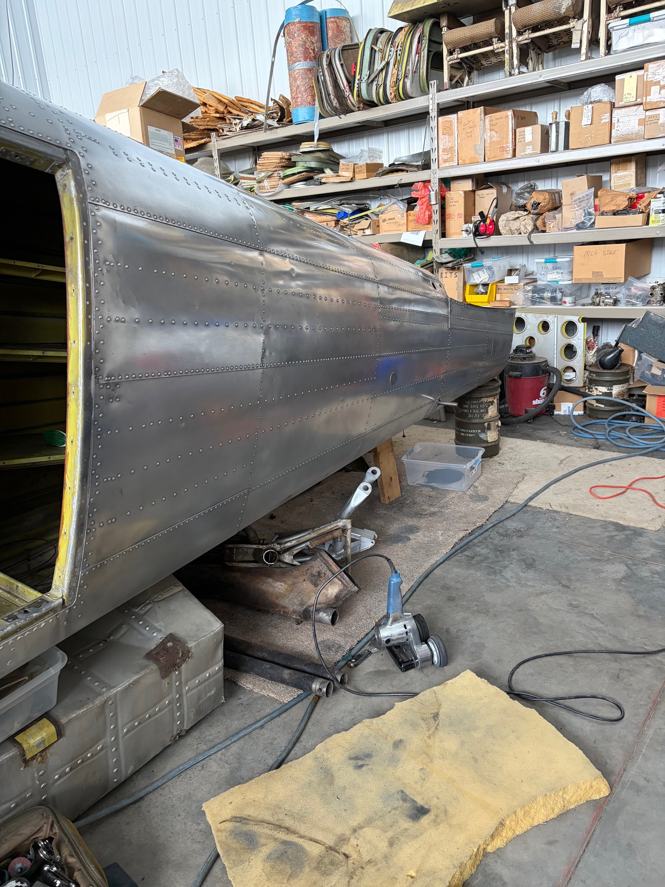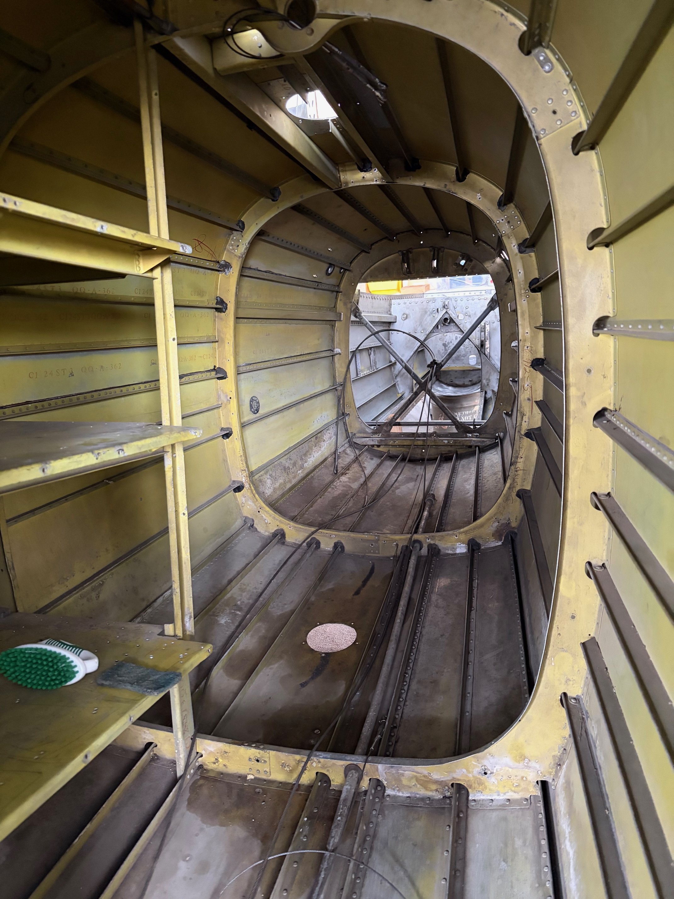 Sooo much work! Removing 30 years of oxidation, old paint, and stuff. This is only step one with many more to go. The tail section is all empty and we started cleaning it, getting ready for pressure washing and priming. All hardware, pulleys, etc are being replace with new. After that we will start putting it back together. Horizontal stab is next. I’ll keep you posted.